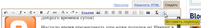 Есть несколько способов реализовать "Читать далее" для поста. Если вы используете новый редактор постов (имеется на Blogger in Draft, либо включите его на своей странице настроек), то на панели инструментов редактора в самом конце есть кнопка "Вставить переход". Кликните на этой кнопке и в том месте где стоит курсор появится "разрыв" страницы. Все что после него не будет показано в анонсе, а только в "Читать далее".