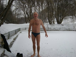 Вода кажется ледяной, но на самом деле, когда мороз она даже теплая. Поэтому, пока племянник осваивал местные кручи, я отогревался в проруби, чтобы не замерзнуть.