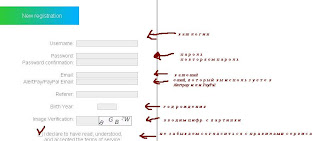 Как мы видим, все весьма просто. Вам нужно вписать ваш логин, пароль (от 4 до 20 символов), электронный адрес, второй электронный адрес, который вы используете в платежных системах Alertpay или Paypal, указать год рождения и подтвердить, что вы не робот и обязуетесь соблюдать условия и правила сайта.