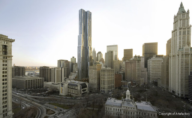 Расположенное в самом центре Манхеттена в двух шагах от Ground Zero в 8 Spruce Street, здание имеет высоту 265 м (это на 60 м меньше, чем Эйфелева башня), разбито на 76 этажей и разместило 903 квартиры.