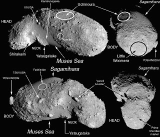 Астероид, как известно, представляет собой небольшое небесное тело Солнечной системы. Подобный планетам по образу, астероид значительно меньше по размеру. Классифицируют астероиды также по размеру, как небесные тела, размером более 50 метров, меньшие называют метеорными телами, которые, по словам ученных, попав в Земную атмосферу, почти полностью сгорают. По-простому астероиды – это очень большие камни. Химический состав: большинство углеродные 75%, часть 15% - силикатные, остальные металлические. Вот, например, что увидел японский зонд Hayabusa ("Хаябуса") изучая астероид Itokawa ( Итокава):