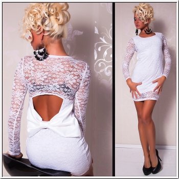 Сексуальное короткое платье - туника из стрейч гипюра с оригинальным вырезом и бантом на спине.