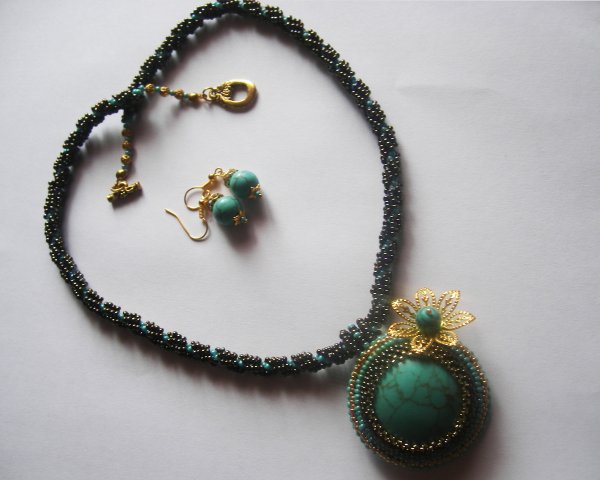2012-09-19 10:59:34 (читать в оригинале)Кулон выполнен из чешского и японского бисера, кабошон бирюза(имитация), фурнитура под золото!
