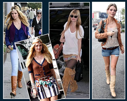 Бохо или богемный шик - это смесь старинного винтажа, ньюхиппи, и эдакого бомж стиля, очень популярного с Америке и немного расбавлено спортивным стилем. Но возродился бохо тем не менее на улицах Лондона благодаря всем известным Сиенне Миллер и Кейт Мосс. И даже в большей степени Сиенна была и остаеться королевой бохо. И это звание принадлежит ей по праву надо заметить. Летящие юбки, шляпы с большими полями, кожанные жилеты, топы в стиле хиппи - чем не бохо шик. а для Сиенны он был повседневностью. Но не только Кейт и Сиенна создают неповторимые бохо-образы. Это и Ванеса Паради и кейт Хадсон и сестры Олсен и иногда кира Найтли ( но у нее бохо как раз с налетом гранжа). Так как же все таки нам с вами создать образ в стиле богемного шика? Все очень просто. Для начала надо как следует порыться в "бабушкиных сундуках" и отбросить все запреты в одежде. Сочетай и смешивай - так звучит главное правило бохо. Казалось бы некоторые узоры, тексттуры, цвета едва ли можно сочетать между собой. В бохо все можно. берем легкий хлопковый топ и одеваем сверху вязанное болеро и доболняем наряд летящей юбкой или узкими джинцами и сандалями, разбавляем крупными броскими аксессуарами и наш богемный образ готов. Итак базовые вещи - как я уже говорила длинные юбки, топы в крестьянском стиле, разнообразные жилеты, кардиганы, болеро, цветастые туники и платья, обувь с бахромой, объеемные сумки,, можно тоже с бахромой, разнообразие платков и повязок, причем платки можно использовать не только на шею, но и как пояс и повязку на голову. А как вы будете это сочетать дело вашего вкуса и буйной фантазии.