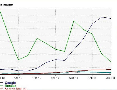 Это прям какой-то заговор двух поисковых систем.Если трафик падает на Гугл,то он растет на Яндексе и наоборот.На графике показаны не проценты,а численность посетителей.