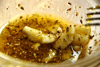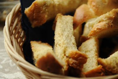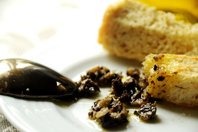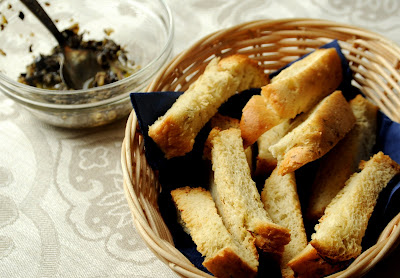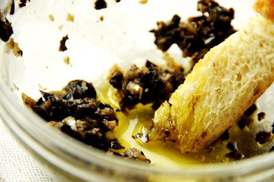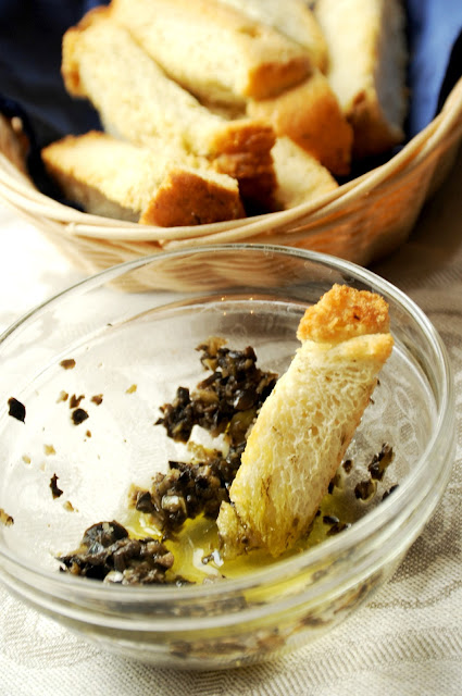 Сначала делаем сухарики. Думаю, тут все понятно. Теперь самая "сложная" часть этого рецепта. Забрасываем оливки и маслины в блендер и делаем мелко нарезанную массу. Или просто мелко нарезаем маслины ножом. Перекладываем все в подходящую тарелку и заливаем маслом. Вот, впрочем, и все!