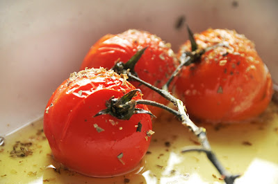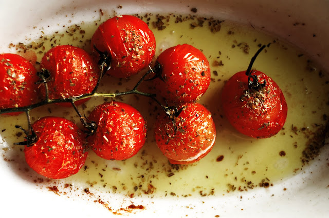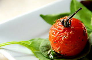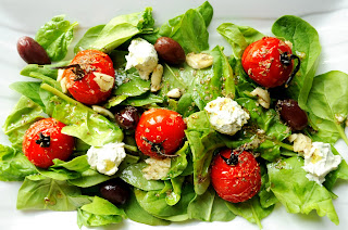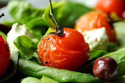 Самый ответственный момент: достаем помидоры, выкладываем их на тарелку со шпинатом, делаем шарики из творога, выкладываем каломаты и все поливаем соусом. ВСЕ! Салат готофф!