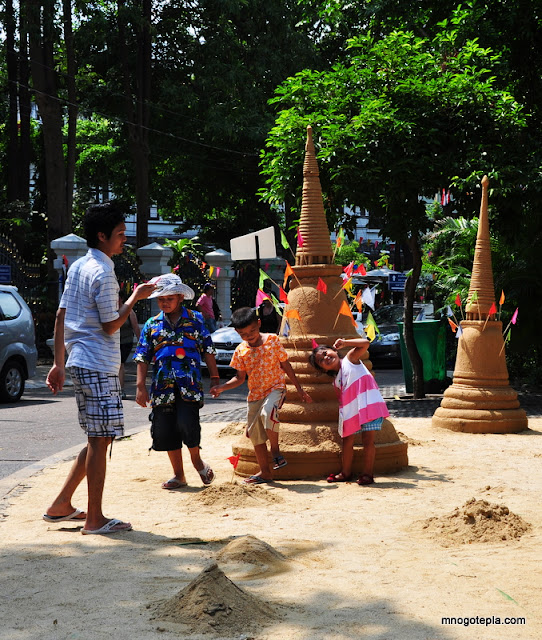 Всё население города вооружается огромными пластиковыми пистолетами, ведрами, шлангами,запасается водой и...начинается водная вакханалия! Все от мала до велика с детским весельем играют в водную войну. Самые ожесточенные бои проходят на Каосан Роад. Туда лучше пойти без фототехники и документов и придаться всеобщему сумасшествию, хотя бы раз в год.