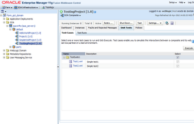 - Зайти в Oracle Enterprise Manager Fusion Middleware Control, выбрать наш композит и перейти в закладку "Unit Tests":