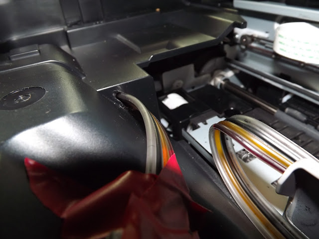 А теперь один из шедевров установки СНПЧ. Canon MP280 попал мне в ремонт с предельно четкой формулировкой дефекта: "Что с ним я не знаю, вообщем надо, что бы печатал". То, что у человека была пустая емкость-донор черных чернил, его по всей видимости не волновало. Меня очень заинтересовал шлейф, который уходил в принтер около разъема USB.