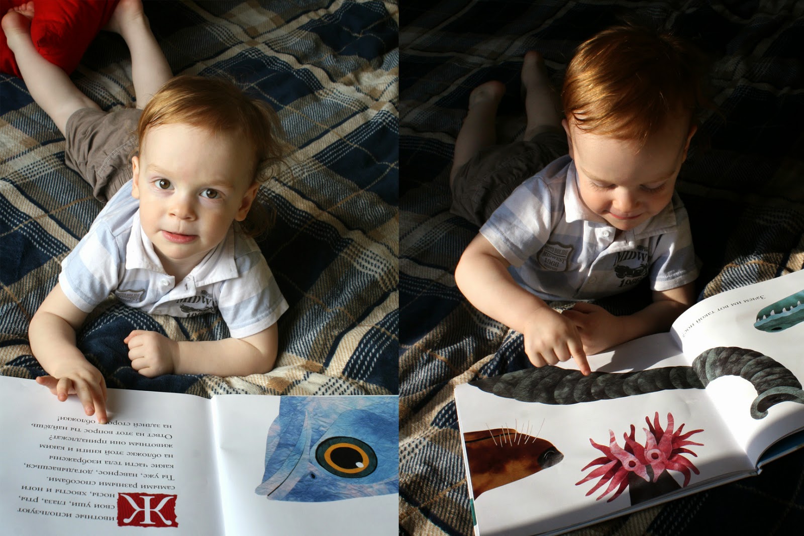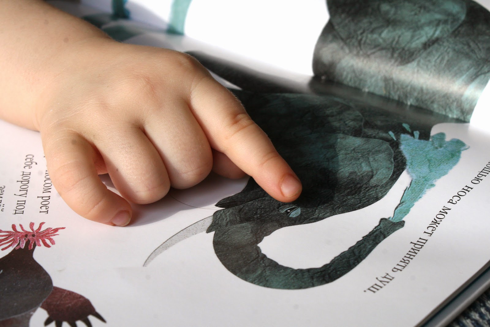 И еще много интересного – как широко может змея открыть рот, чтобы проглотить добычу; как обезьянка здорово висит на ветке с помощью хвоста; как крот носом роет землю… И я ему практически ничего не объясняю. Иллюстрации настолько точные, что он сам во всем разбирается. Книгу "читаем" не взахлеб, но она для нас долгоиграющая. Открывая каждый раз, учимся чему-нибудь новому. И я уверена, еще много открытий ждет нас. Думаю, что для нашего возраста (2года) это более чем нормально.