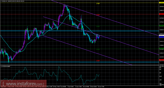 Хайкен Аши – индикатор, окрашивающий бары в голубой или фиолетовый цвета.Материал предоставлен компанией InstaForex - www.instaforex.comТехническая картина инструмента GOLD по системе «Каналы регрессии» за 23 июня 2017 года