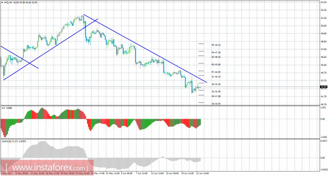 Анализ сырой нефти за 23 июня показывает, что цена продолжает уверенное нисходящее движение с частыми, но минимальными коррекциями. Целями для движения вниз сейчас являются уровни поддержки S4 – 41,88 и S5 – 40,94, если цена закрепится ниже 42,46. Целью для любых восходящих коррекций является линия тренда. Нисходящая линия тренда поддерживает торгующих на понижение и делает актуальными ордера на продажу. Ее преодоление изменит тенденцию на восходящую и сделает актуальными длинные позиции. Индикатор Awesome показывает текущее восходящее движение, так как последний закрытый бар зеленого цвета. OsMA также развернулся наверх, что говорит о восходящем характере движения и в более долгосрочном плане. Отскок от линии тренда может спровоцировать возобновление нисходящего тренда.