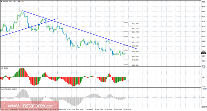 Анализ природного газа за 23 июня показывает, что цена в целом продолжает движение вниз, но не может преодолеть уровень поддержки S3. На данный момент по-прежнему актуально нисходящее движение с целями уровни поддержки S4 – 2,8370 и S5 – 2,7720, если цена преодолеет 2,8770. Целями для витка восходящей коррекции выступают уровни 2,9420 и 3,0070, если цена останется выше 2,8770. Нисходящая линия тренда была перестроена и по-прежнему поддерживает сейчас торгующих на понижение и делает актуальными ордера на продажу. Если цена закрепится выше нее, это укажет на смену тенденции на рынке и станут актуальными длинные позиции. Индикатор Awesome показывает локальное восходящее движение, последний закрытый бар окрашен в зеленый цвет. OsMA также развернулся наверх, что сигнализирует о восходящем движении и в среднесрочной перспективе.