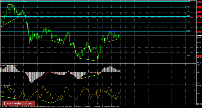 Новая бычья дивергенция позволила паре выполнить разворот в пользу американской валюты и начать новый возврат к уровню коррекции 100,0% - 111,69. Отбой котировок USD/JPY от уровня Фибо 100,0% - 111,69 позволит трейдерам ожидать разворот в пользу японской иены и некоторое падение в направлении коррекционного уровня 161,8% - 109,32. Новых назревающих дивергенций 23 июня не видно. Закрепление курса пары над уровнем Фибо 100,0% повысит вероятность продолжения роста в направлении уровня коррекции 76,4% - 112,58.