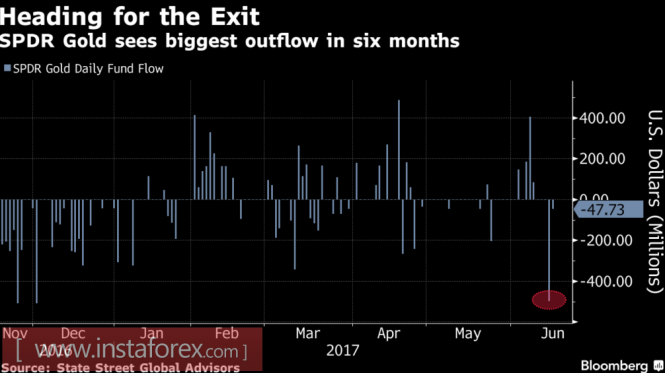 Если поклонники продуктов биржевых специализированных фондов действовали по факту, то финансовые менеджеры предпочли перестраховаться еще до встречи Комитета открытого рынка. По итогам недели к 13 июня они сократили чистую длинную позицию по драгметаллу на 11%, до 155037 фьючерсных и опционных контрактов. Как показатели дальнейшие события, это уберегло их от бед. Обвал котировок XAU/USD произошел из-за «ястребиной» риторики Джанет Йеллен и ее близкого соратника президента ФРБ Нью-Йорка Уильяма Дадли. Они выразили уверенность в светлом будущем американской экономики и в скором восстановлении инфляции, что разубедило инвесторов продавать доллар США. Обратная корреляция последнего с золотом запустило волну коррекции по драгметаллу.