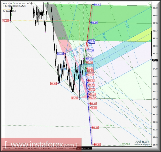 Развитие движения индекса доллара (#USDX) в период 20 июня - 04 июля 2017 г. будет обусловлено отработкой границ зоны равновесия (97.10 <-> 97.30 <-> 97.50) вил операционного масштаба Minuette и канала 1/2 Median Line (97.20 <-> 97.60 <-> 97.90) вил операционного масштаба Minute.