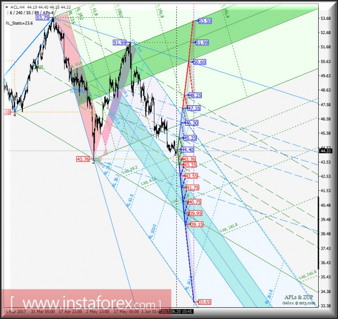 Развитие движения цены инструмента (#CL) в период 20 июня - 04 июля 2017 г. будет обусловлено отработкой границ каналов 1/2 Median Line вил операционных масштабов -> Minute (43.35 <-> 44.40 <-> 45.25) и Minuette (45.25 <-> 46.30 <-> 47.35).