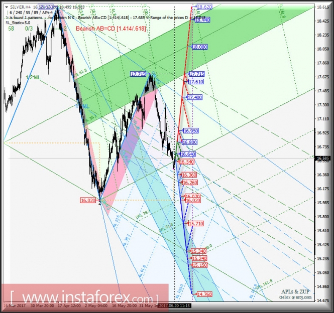 Развитие движения цены инструмента (Silver Spot) в период 20 июня - 04 июля 2017 г. будет обусловлено отработкой границ каналов 1/2 Median Line вил операционных масштабов -> Minute (16.800 <-> 16.540 <-> 16.260) и Minuette (16.640 <-> 16.360 <-> 16.070).
