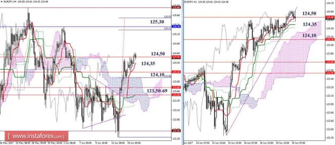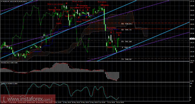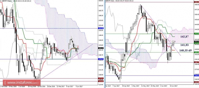 Индикатор MACD – красная линия и гистограмма с белыми барами в окне индикаторов.Материал предоставлен компанией InstaForex - www.instaforex.comДневной обзор GBP/JPY и EUR/JPY на 20.06.17. Индикатор Ишимоку