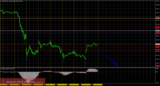 На 15-минутном графике рекомендуется рассматривать ордера на продажу с целью 140,45 при закреплении цены ниже 144,71 (Тенкан-сен), ордером Stop Loss выше 144,71 и при направленном вниз MACD.