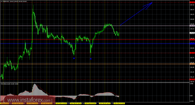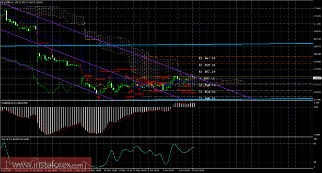 На младшем графике рекомендуется рассматривать ордера на покупку с целью 157,34 при закреплении цены выше Сенкоу Спан Б (155,40) и уровнем S/L ниже 155,40 и при направленном вверх индикаторе MACD.