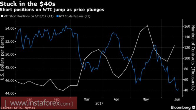 2017-06-20 15:34:32 (читать в оригинале)Падение цен на бензин, ожидания «медвежьей» статистики по американским запасам нефти, рост числа буровых установок от Baker Hughes на протяжении 22-х недель подряд, сомнения относительно способности ОПЕК вывести рынок на баланс и укрепление доллара США стали главными драйверами обвала котировок фьючерсов на Brent и WTI к уровням семимесячных минимумов. По словам опционных трейдеров, анализ операций хеджирования убеждает, что цены на техасский сорт способны уйти ниже $41 за баррель, при этом финансовые менеджеры впервые в истории ведения учета CFTC стали нетто-продавцами бензина в разгар автомобильного сезона в Штатах.