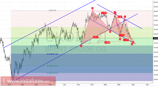 Технически котировки на расстояние вытянутой руки подошли к зоне конвергенции $44,35-45,35 за баррель, выявленной при помощи таргетов на 88,6% и 127,2 по паттернам «Летучая мышь» и AB=CD. Неспособность ее преодолеть станет поводом для отката.