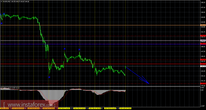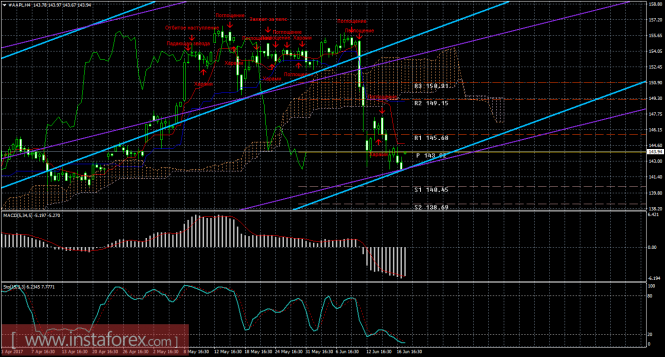 На 15-минутном графике рекомендуется рассматривать ордера на продажу с целью 140,45 при закреплении цены ниже 144,75 (Тенкан-сен), ордером Stop Loss выше 144,75 и при направленном вниз MACD.