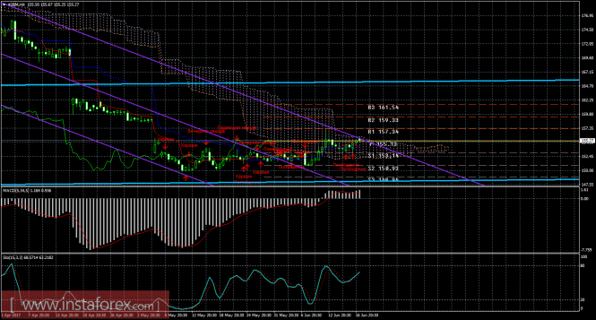 На младшем графике рекомендуется рассматривать ордера на покупку с целью 157,34 при закреплении цены выше Сенкоу Спан Б (155,77) и уровнем S/L ниже 155,77 и при направленном вверх индикаторе MACD.