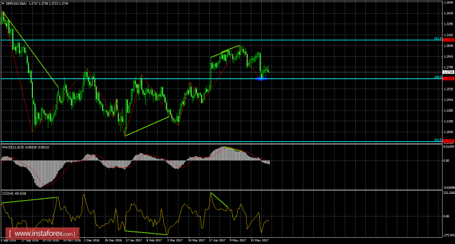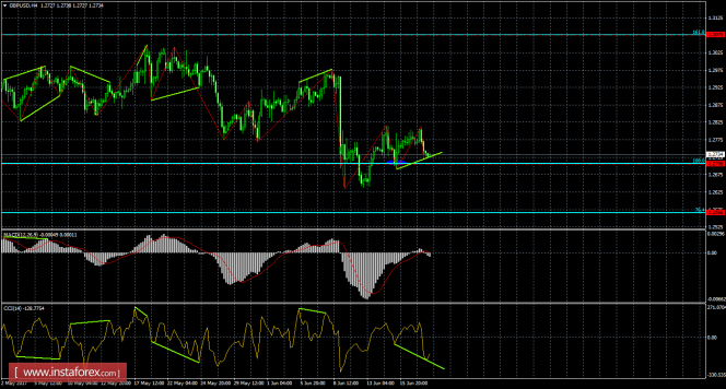 Котировки GBP/USD выполнили разворот в пользу американской валюты и начали процесс возврата к уровню коррекции 100,0% - 1,2706. 20 июня назревает бычья дивергенция у индикатора CCI: соответствующие друг другу лоу цены и индикатора не совпадают. Бычья дивергенция позволит трейдерам рассчитывать на разворот в пользу английского фунта и возобновление процесс роста в направлении коррекционного уровня 161,8% - 1,3076. Закрепление курса пары под уровнем Фибо 100,0% повысит шансы на продолжение падения в направлении уровня коррекции 76,4% - 1,2566.