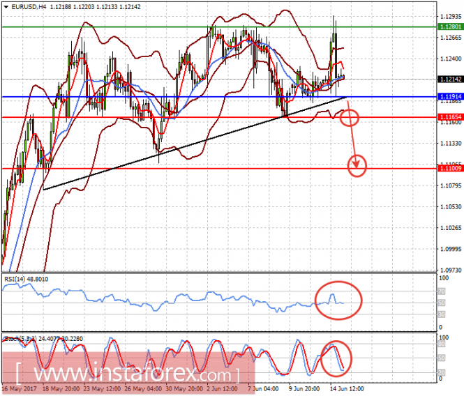 Пара EURUSD торгуется выше отметки 1.1190, прорыв которой усилит ее снижение. Сначала цена может упасть к 1.1165, а затем к 1.1100 с перспективами более глубокого падения.