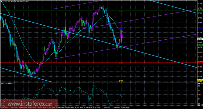 Исходя из анализа серебра 15 июня следует, что цена скорректировалась к скользящей средней и не смогла ее преодолеть, возобновив движение вниз. Старший канал направлен вниз, что свидетельствует о нисходящем направлении движения глобального тренда. Младший канал направлен вверх, что означает восходящее движение в менее долгосрочном плане. В данный момент цена находится ниже мувинга и ниже уровня Мюррея «4/8», что делает более вероятным продолжение нисходящего движения. Первой целью для движения вниз сейчас является уровень Мюррея «3/8» - 16,797, который уже был отработан. Если цена преодолеет этот уровень, то новой целью будет выступать уровень Мюррея «2/8» - 16,406. Скользящая средняя линия направлена вниз, а цена располагается ниже нее, что сигнализирует о текущем нисходящем направлении движения. Длинные позиции станут актуальными только после закрепления выше мувинга. Хайкен Аши окрасил последние бары в голубой цвет, что сигнализирует о текущем движении вниз, таким образом, до разворота индикатора обратно вверх, что засвидетельствует начало новой коррекции, открытые короткие позиции можно поддерживать. Индикатор CCI находится около нулевого уровня, что сигнализирует об отсутствии какой-либо перекупленности и перепроданности инструмента.