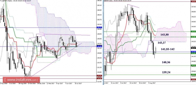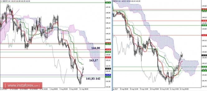 Уровни старших таймов 141,83 – 142,00 в настоящий момент усиливают ключевые поддержки Н4 (Тенкан) и Н1 (Киджун). Закрепление ниже уровней будет способствовать завершению подъёма. Пробой облака Н1 и ликвидация мёртвого креста Н4 (Киджун сейчас 142,83), позволит рассмотреть продолжение восходящего движения, ориентирами которого выступят уровни старших временных интервалов и цель на пробой облака Н1.