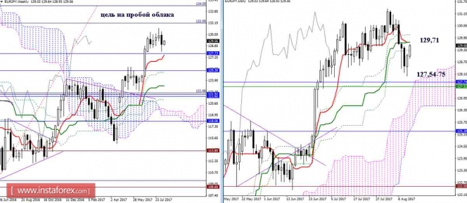 Валютная пара предположительно завершила построение волны (B) около отметки 1,1898. Сейчас возможно возобновление снижения котировок в рамках первых волн в составе будущей (С) с целями, расположенными около отметок 1,1696 и 1,1619, что соответствует 100,0% и 76,4% по Фибоначчи. В рамках коррекционной волны 2 котировки выросли выше 18 фигуры, теперь эта волна может закончить свое построение.Материал предоставлен компанией InstaForex - www.instaforex.comДневной обзор GBP/JPY и EUR/JPY на 14.08.17. Индикатор Ишимоку