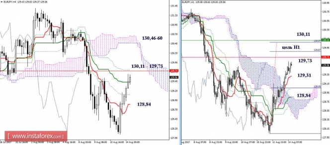 Пара исполнила восходящее движение, максимально поднявшись под ключевые сопротивления – 129,73-130,11 (дневной крест + цель на пробой облака Н1 + Фибо Киджун Н4). Пробой зоны существенно изменит баланс сил младших таймов, а подъём и преодоление сопротивления облака Н4 откроет перед игроками на повышение новые горизонты. Ближайшая поддержка сейчас расположена на 129,31 (Тенкан Н1), но наиболее укреплённой зоной является район 128,84 (Тенкан Н4 + Киджун Н1 + облако Н1).