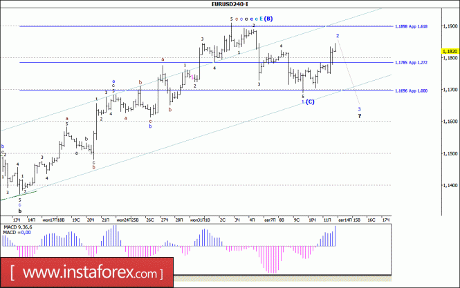 Во второй половине пятничных торгов пара EUR/USD продолжила развитие восходящего движения и, прибавив в цене более 90 п.п., в конце дня достигла отметки 1,1845. При этом можно предположить, что валютная пара оставалась в стадии формирования принявшей несколько удлиненный вид 2-й волны в составе будущей (С). Если это так и эта 2-я волна в (С) не станет принимать еще более протяженную во времени форму, то практически от максимума последнего дня минувшей недели валютная пара возобновит снижение котировок, обозначив тем самым начало 3-й волны в (С).