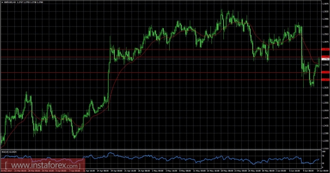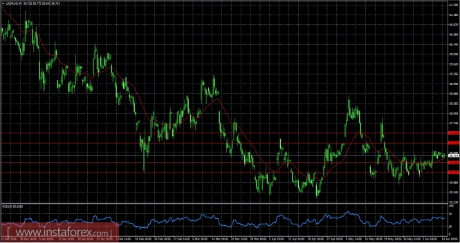 Курс фунта стерлингов 14 июня скорректировался к скользящей средней линии и может отскочить от нее, завершив коррекционное движение. Старший канал направлен наверх, что свидетельствует о восходящем направлении глобального тренда. Младший канал направлен вниз, что означает нисходящее направление движения в менее долгосрочном плане. Цена сейчас находится ниже уровня Мюррея «1/8», а также ниже скользящей средней, что говорит в пользу нисходящей тенденции. Текущей целью нисходящего движения является уровень Мюррея «0/8» - 1,2695. Если этот таргет будет преодолен, то новой актуальной целью будет выступать уровень Мюррея «-1/8» - 1,2573. Индикатор Хайкен Аши окрасил последние бары в фиолетовый цвет, что свидетельствует о локальном восходящем движении, разворот индикатора вниз просигнализирует о завершении восходящей коррекции, а ордера на продажу станут вновь актуальными. Скользящая средняя линия направлена вниз, а цена в свою очередь находится ниже нее, поэтому сейчас более актуальна нисходящая тенденция. Длинные позиции можно будет рассматривать только после закрепления цены выше мувинга с целью уровень Мюррея «2/8» - 1,2939. Индикатор CCI находится около уровня 0, что обозначает отсутствие любой перекупленности и перепроданности валютной пары.