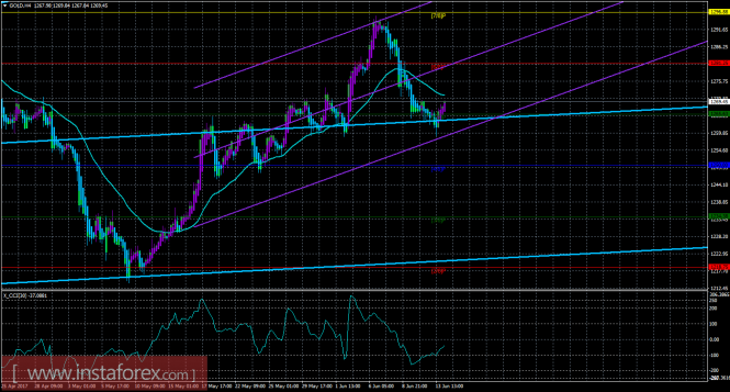 Хайкен Аши – индикатор, окрашивающий бары в голубой или фиолетовый цвета.Материал предоставлен компанией InstaForex - www.instaforex.comТехническая картина инструмента GOLD по системе «Каналы регрессии» за 14 июня 2017 года