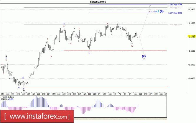 Британская валюта продолжает построение повышательного участка тренда. Волна 4, в 3 или С усложняет свою внутреннюю структуру с целями, расположенными около отметки 1,2624, что приравнивается к 61,8% по Фибоначчи, и немного ниже. Неудачная попытка прорыва отметки 1,2624 предупредит о готовности инструмента к повышению котировок в рамках волны 5, в 3 или С.Материал предоставлен компанией InstaForex - www.instaforex.comВолновой анализ валютной пары EUR/USD за 13 июня 2017 года