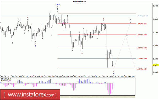 Волновая разметка предполагает построение нисходящего набора волн. Волна b, в с, в с, в с, в Е, в B завершена. Соответственно, понижение котировок может возобновиться в рамках волны с, в с, в с, в с, в Е, в B с целями, расположенными около отметки 0,9550, что соответствует 61,8% по Фибоначчи, и ниже, около 95 фигуры. Волна с, в с, в с, в Е, в B принимает весьма сложный и протяженный вид и может усложниться еще больше. В то же время можно сказать, что она близится к своему завершению или уже завершена.Материал предоставлен компанией InstaForex - www.instaforex.comВолновой анализ валютной пары GBP/USD за 13 июня 2017 года