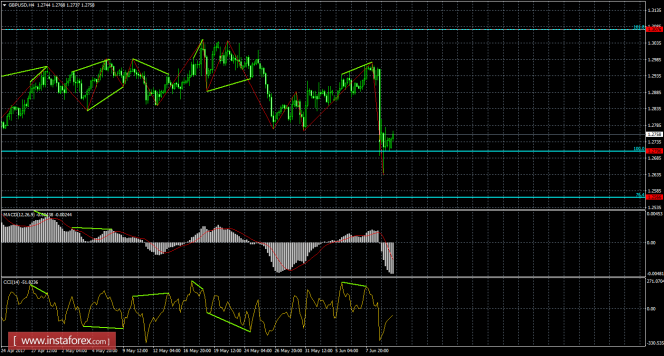 После образования медвежьей дивергенции котировки выполнили падение к уровню коррекции 100,0% - 1,2708. Медвежья дивергенция у индикатора CCI: последний пик котировок получился выше предыдущего, а аналогичный пик индикатора - ниже. Отбой котировок от уровня Фибо 100,0% позволил выполнить разворот в пользу фунта стерлингов и некоторый рост в направлении коррекционного уровня 161,8% - 1,3076. Назревающих дивергенций 12 июня не наблюдается. Закрепление курса пары под уровнем коррекции 100,0% сработает в пользу дальнейшего падения в направлении следующего уровня Фибо 76,4% - 1,2566.