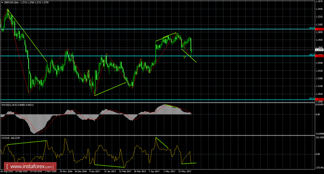 На 24-часовом графике пара выполнила разворот в пользу доллара США и падение к коррекционному уровню 200,0% - 1,2653. Отбой пары от уровня Фибо 200,0% позволит трейдерам рассчитывать на разворот в пользу английской валюты и некоторый рост в направлении уровня Фибо 161,8% - 1,3103. Назревает бычья дивергенция у индикатора CCI: последний лоу котировок уже ниже предыдущего, а аналогичный лоу индикатора может получиться выше. Бычья дивергенция аналогично сработает в пользу валюты Англии. Закрепление котировок под уровнем Фибо 200,0% повысит вероятность продолжения падения в направлении следующего уровня коррекции 261,8% - 1,1925.