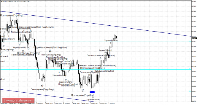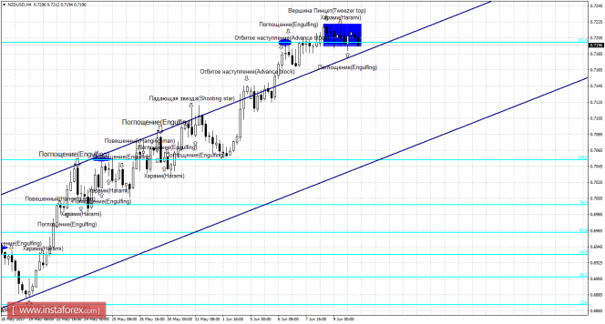 На 24-часовом графике пара выполнила закрепление над коррекционным уровнем 23,6% - 0,7171. В итоге рост котировок может быть продолжен в направлении следующего уровня Фибо 0,0% - 0,7483. Образование медвежьей формации позволит ожидать разворот в пользу валюты США и некоторое падение котировок. Такая формация будет трактоваться как трендовый сигнал, так как равноудаленный канал по-прежнему имеет направление «вниз». Закрепление курса пары под уровнем Фибо 23,6% повысит вероятность дальнейшего падения котировок в направлении уровня коррекции 38,2% - 0,6977.