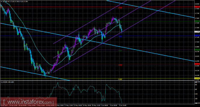 Исходя из анализа серебра 9 июня следует, что цена закрепился ниже мувинга и начал пока что несильное нисходящее движение. Старший канал направлен вниз, что свидетельствует о нисходящем направлении движения глобального тренда. Младший канал направлен вверх, что означает восходящее движение в менее долгосрочном плане. В данный момент цена находится ниже мувинга и ниже уровня Мюррея «5/8», что делает более вероятным продолжение нисходящего движения. Первой целью для движения вниз сейчас является уровень Мюррея «4/8» - 17,188. Если цена преодолеет этот уровень, то новой целью будет выступать уровень Мюррея «3/8» - 16,797. Скользящая средняя линия развернулась вниз, а цена располагается ниже нее, что сигнализирует о текущем нисходящем направлении движения. Длинные позиции станут актуальными только после закрепления выше мувинга. Хайкен Аши окрасил последние бары в голубой цвет, что сигнализирует о текущем движении вниз, таким образом, до разворота индикатора вверх, что засвидетельствует виток коррекционного движения, открытые ордера на продажу можно сопровождать. Индикатор CCI находится около уровня -200, что сигнализирует о сильной перепроданности инструмента, в ближайшее время может начаться восходящая коррекция.