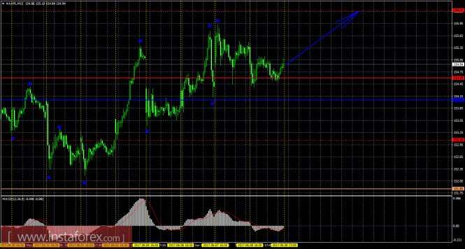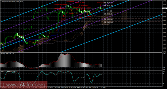 На 15-минутном графике рекомендуется рассматривать ордера на покупку с целью 156,27 при закреплении цены выше 154,60 (Тенкан-сен), ордером Stop Loss ниже 154,60. Разворот индикатора MACD вниз – новый виток коррекции.