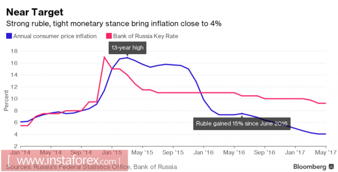 Многое будет зависеть от позиции Банка России, которая, в свою очередь, определяется дальнейшей динамикой инфляции. В апреле-мае потребительские цены достигли отметки 4,1%, на расстояние вытянутой руки приблизившись к таргету в 4%. По мнению экспертов Bloomberg, он будет выполнен к концу года, однако крепкий рубль может внести свои коррективы.