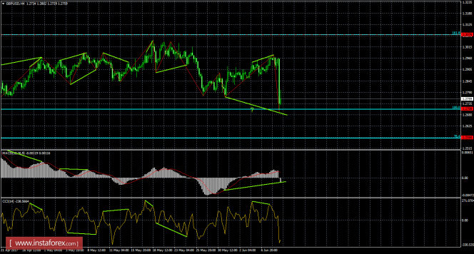 После образования медвежьей дивергенции котировки выполнили разворот в пользу валюты США и падение к уровню коррекции 100,0% - 1,2708. Медвежья дивергенция у индикатора CCI: последний пик котировок получился выше предыдущего, а аналогичный пик индикатора - ниже. Отбой курса пары от уровня Фибо 100,0% позволяет рассчитывать на разворот в пользу английской валюты и некоторый рост в направлении коррекционного уровня 161,8% - 1,3076. Также 9 июня назревает бычья дивергенция у индикатора MACD: последний лоу котировок уже ниже предыдущего, а лоу индикатора может получиться выше. Бычья дивергенция повысит шансы на разворот в пользу фунта стерлингов.