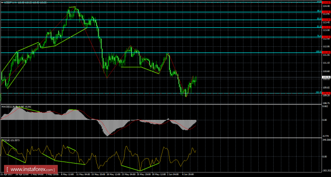 Отбой котировок USD/JPY от уровня Фибо 161,8% - 109,32 позволил паре выполнить разворот в пользу валюты Соединенных Штатов и начать процесс роста в направлении уровня коррекции 100,0% - 111,69. Назревающих дивергенций 9 июня не наблюдается ни у одного индикатора. Закрепление пары под уровнем коррекции 161,8% сработает в пользу японской валюты и возобновления падения котировок в направлении коррекционного уровня 200,0% - 107,85.