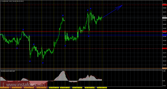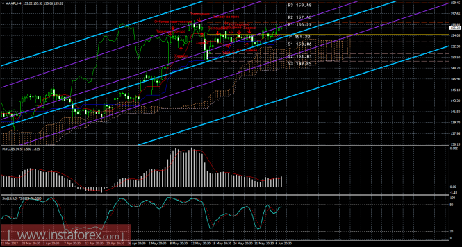 На 15-минутном графике рекомендуется рассматривать ордера на покупку с целью 156,27 при закреплении цены выше 154,32 (Тенкан-сен), ордером Stop Loss ниже 154,32 и при направленном вверх индикаторе MACD.